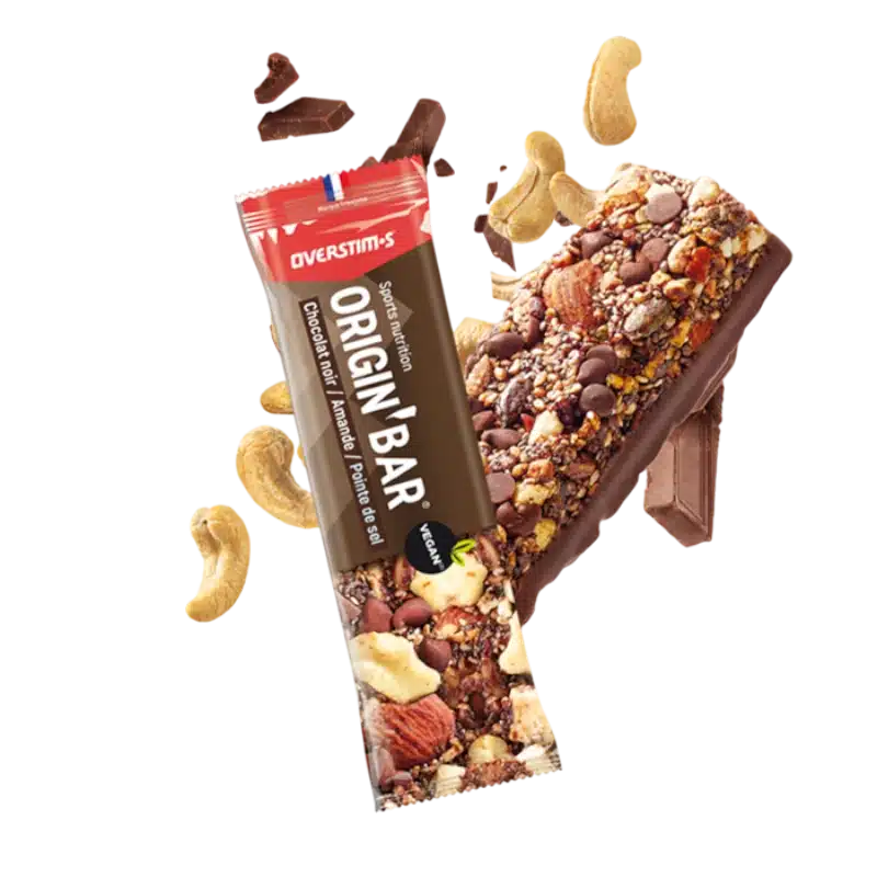Barre énergétique Overstims Origin vegan et sans gluten Chocolat noir Amande : énergie durable, électrolytes et plaisir naturel pour sportifs et athlètes.