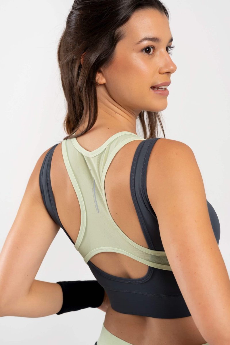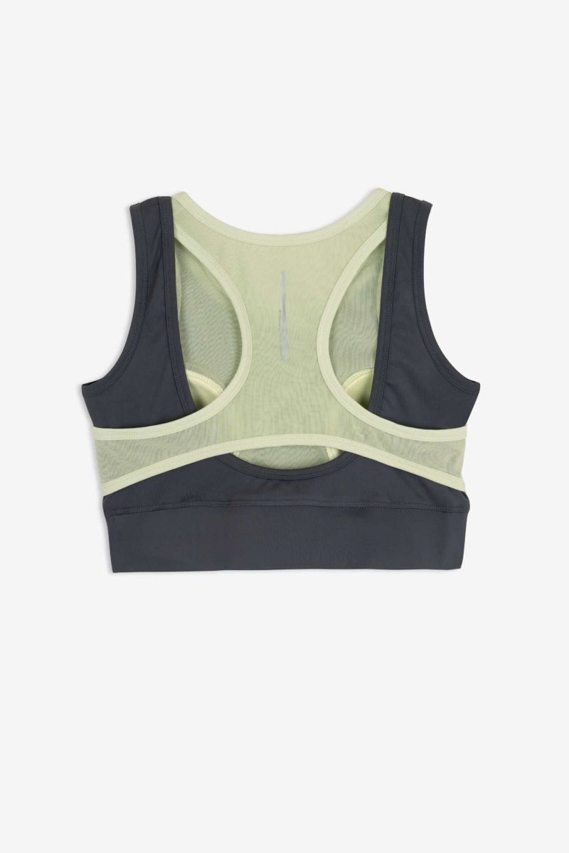 À l’arrière, la brassière se distingue par une découpe en « X » associée à un panneau en mesh respirant, favorisant l’évacuation de la transpiration tout en garantissant une liberté de mouvement maximale.