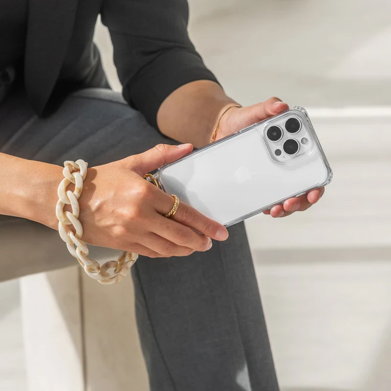 Notre Clear Case notre chaîne courte Chunky Resin Chain pour ton iPhone 17Grâce à des œillets pratiquement invisibles, tu peux facilement accrocher et décrocher les mousquetons dorés de ta chaîne et l’ajuster à ta taille. Les aimants officiels N52 ultra puissants assurent une complète Compatibilité Apple MagSafe. La housse est en 100% de matériaux recyclés et protège non seulement ton iPhone mais aussi l’environnement.