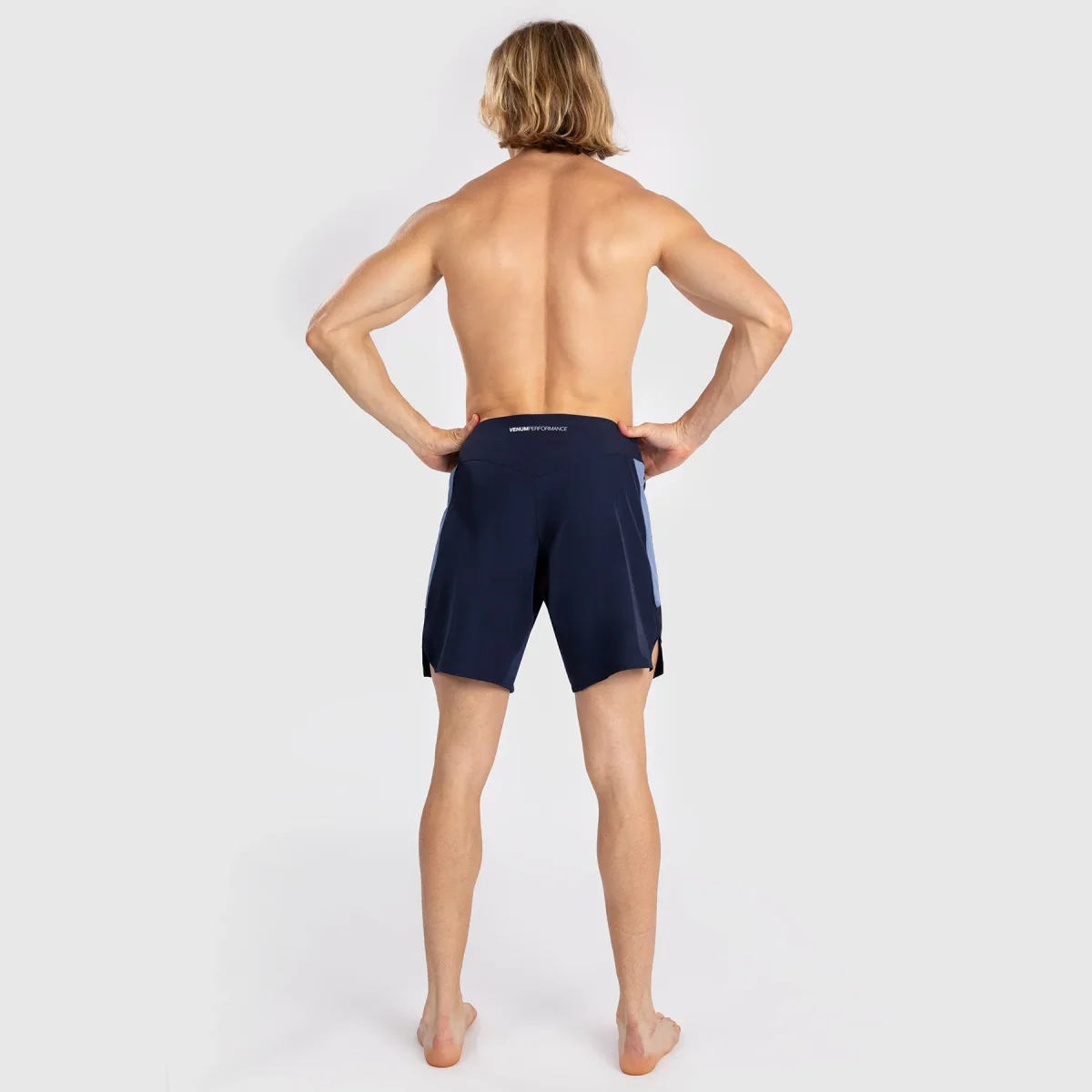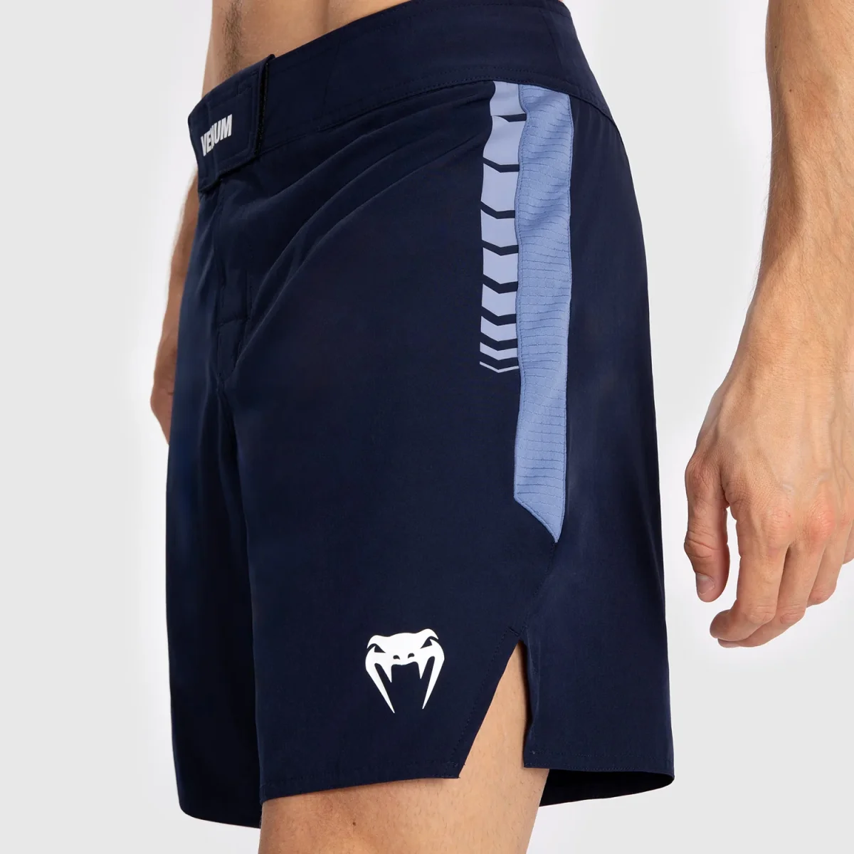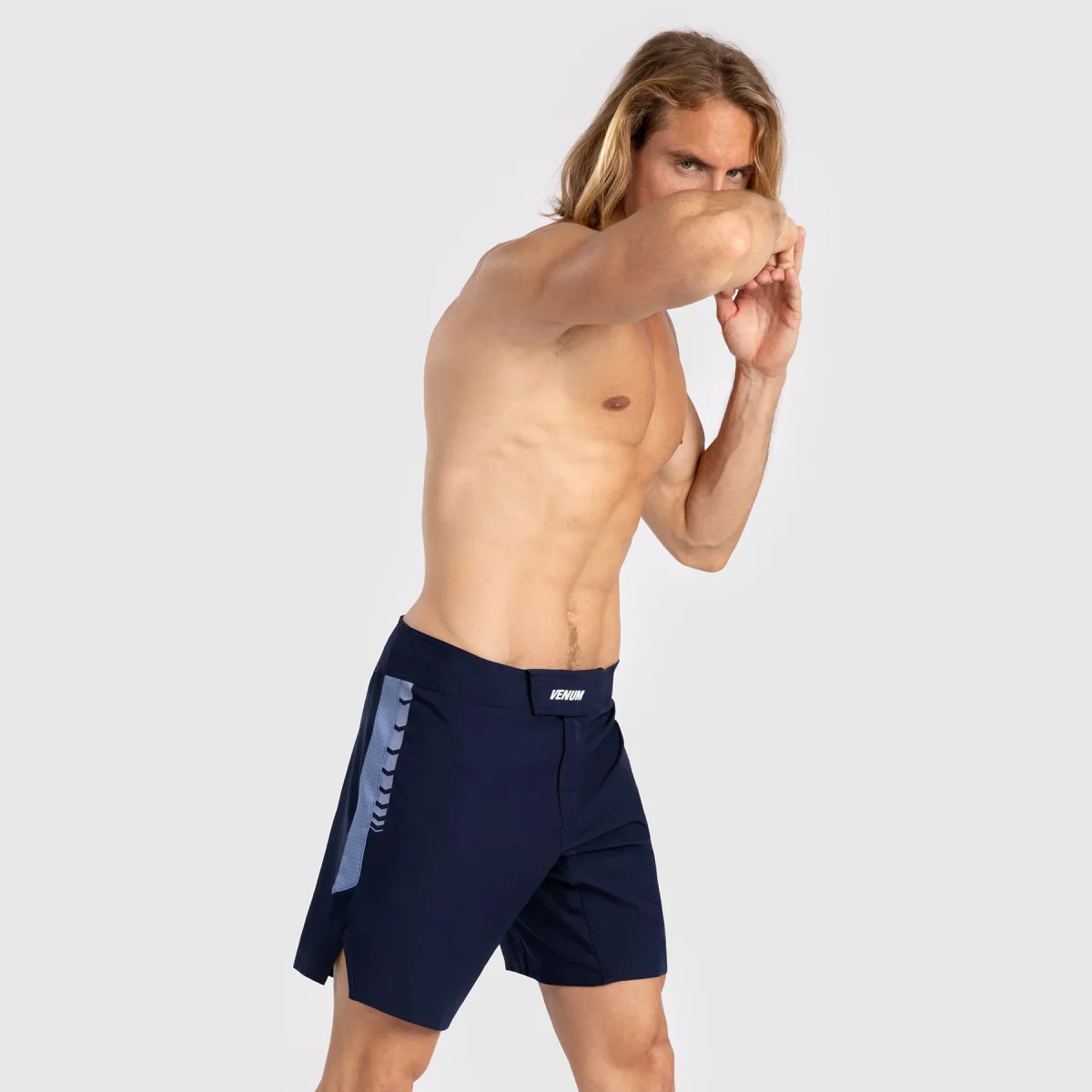 Les shorts de combat légers Venum Tempest pour hommes en bleu marine/bleu sont conçus pour résister à des entraînements intenses et à la compétition. Idéaux pour le MMA, le Jiu-Jitsu et autres sports de combat, le tissu flexible et les fentes latérales permettent de bouger librement.