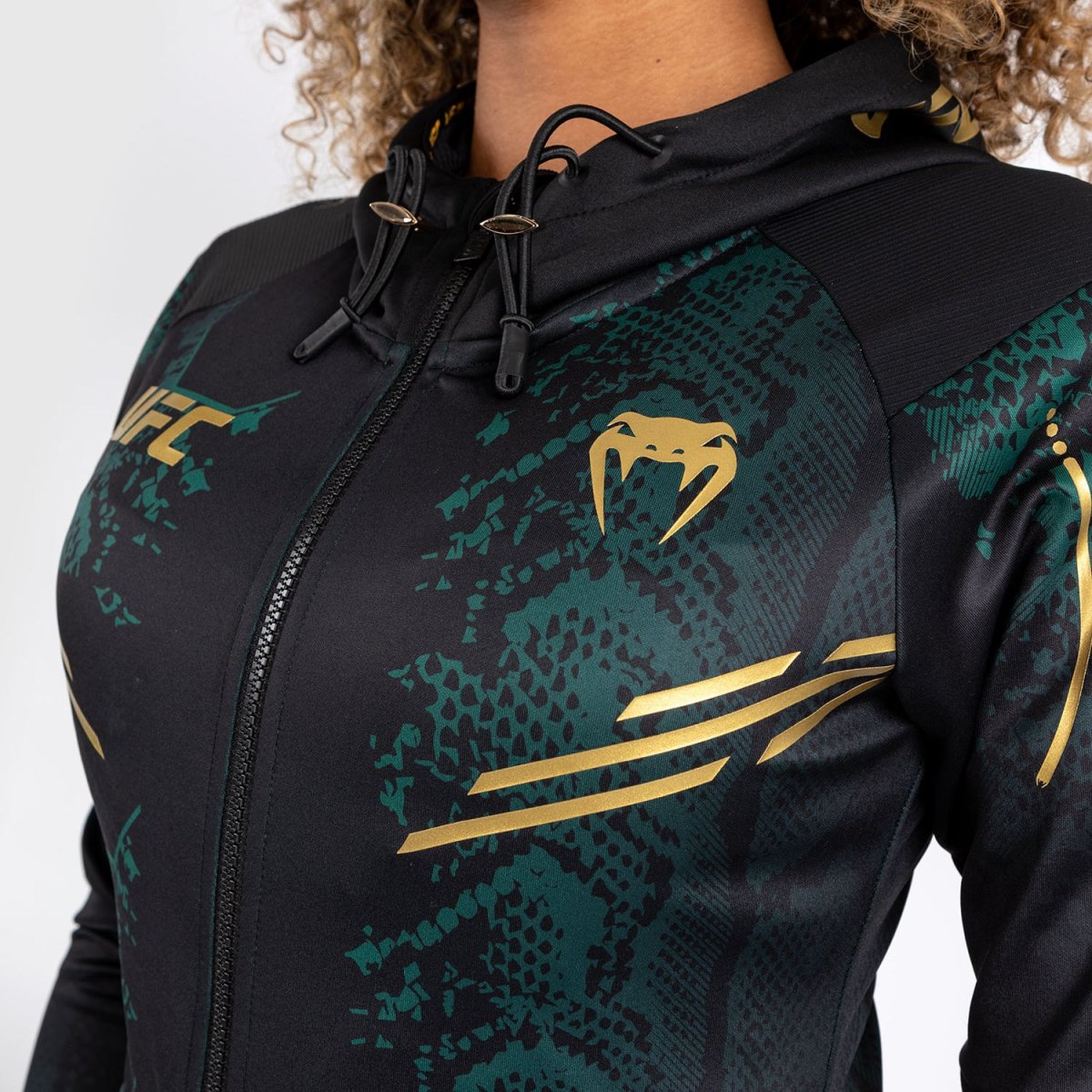 Le sweat à capuche féminin UFC Adrenaline by Venum Authentic Fight Night Walkout Hoodie – Emerald Edition comporte deux poches zippées, ainsi qu’une capuche en maille avec des cordons de serrage réglables. Les poignets et le panneau intérieur des bras sont faits d’un tissu extensible de première qualité, pour permettre aux combattantes d’enlever leur sweat à capuche sans enlever leurs gants.