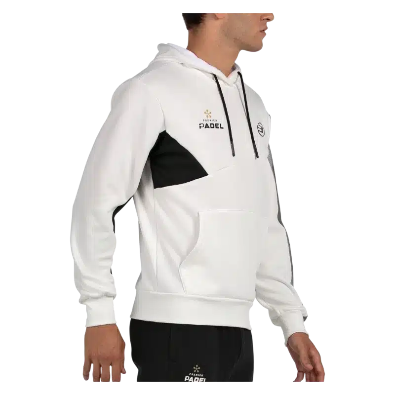 Son design asymétrique, souligné par des empiècements contrastés et une bande graphique distinctive sur la manche gauche, lui confère une identité visuelle dynamique et actuelle. Pratique, il est équipé d’une poche kangourou et d’une capuche confortable, tandis que les graphismes exclusifs Premier Padel apportent une touche signature assumée.