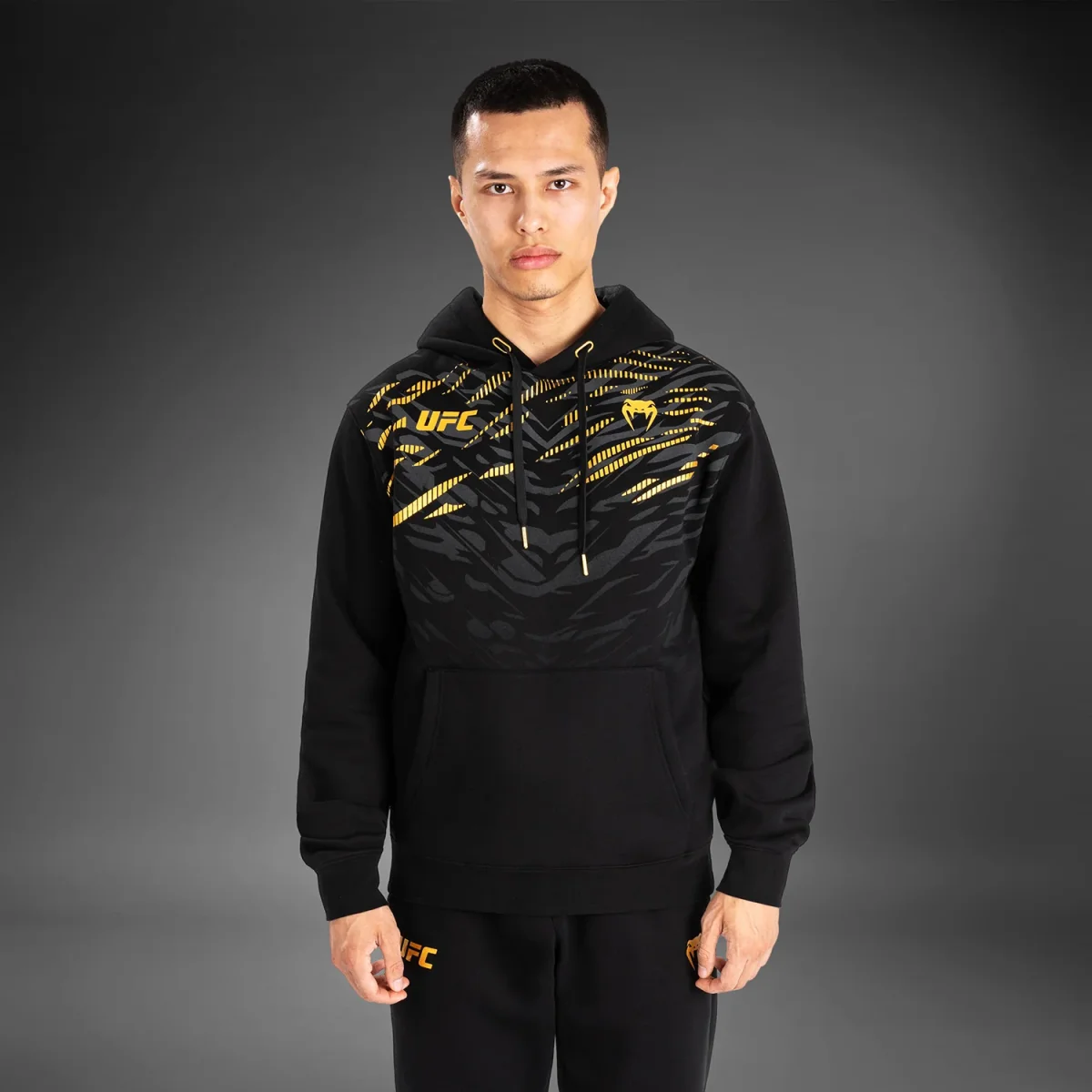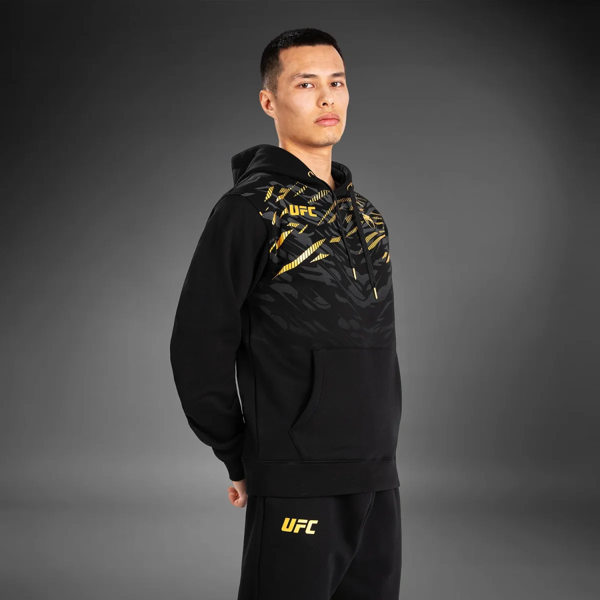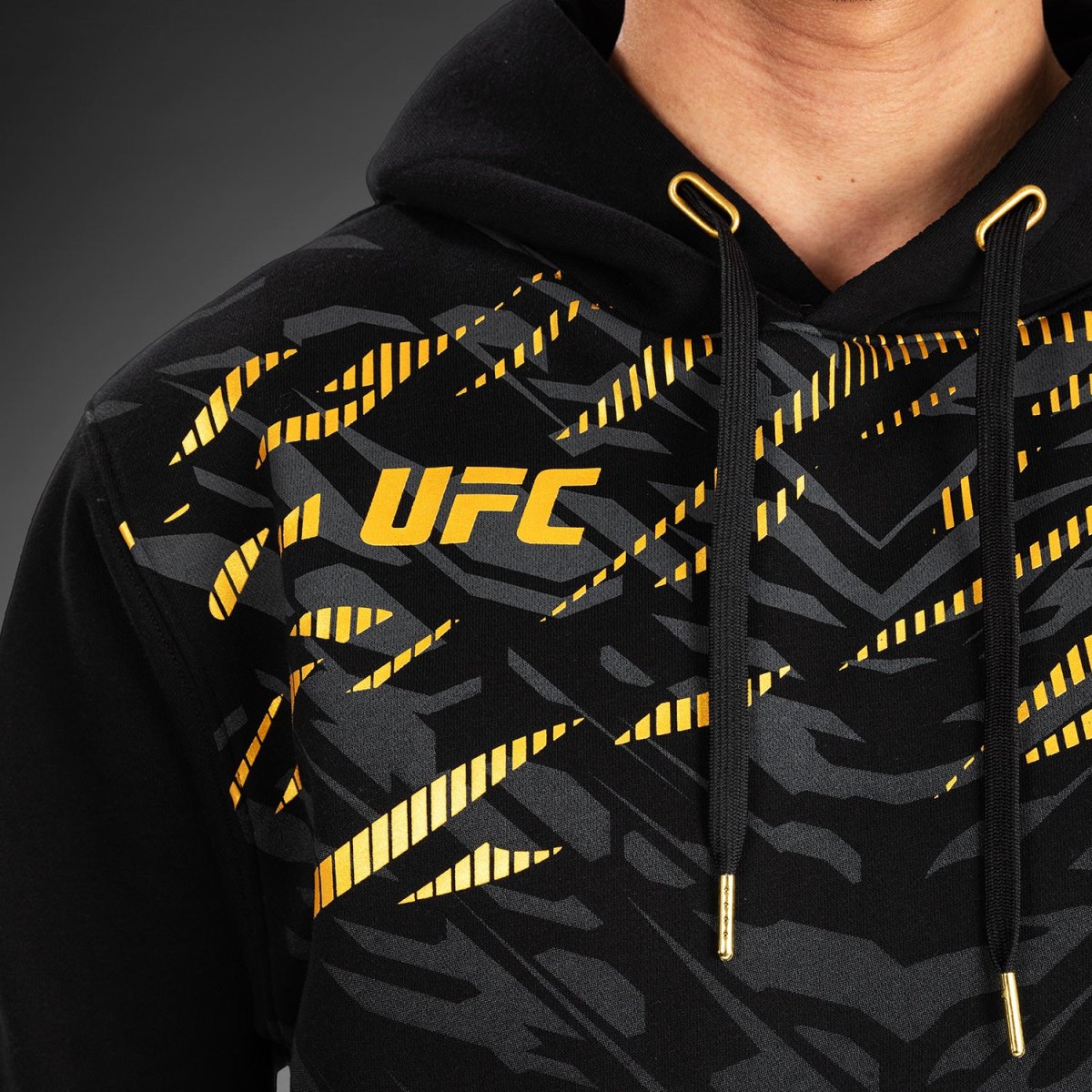 Le sweat à capuche à enfiler Replica pour hommes UFC Fusion par Venum dispose d’une poche avant style kangourou et d’une capuche avec cordon de serrage. Les logos Venum et UFC sont présents sur la poitrine et la capuche. Cette combinaison de couleurs noir/or est réservée aux champions de l’UFC.