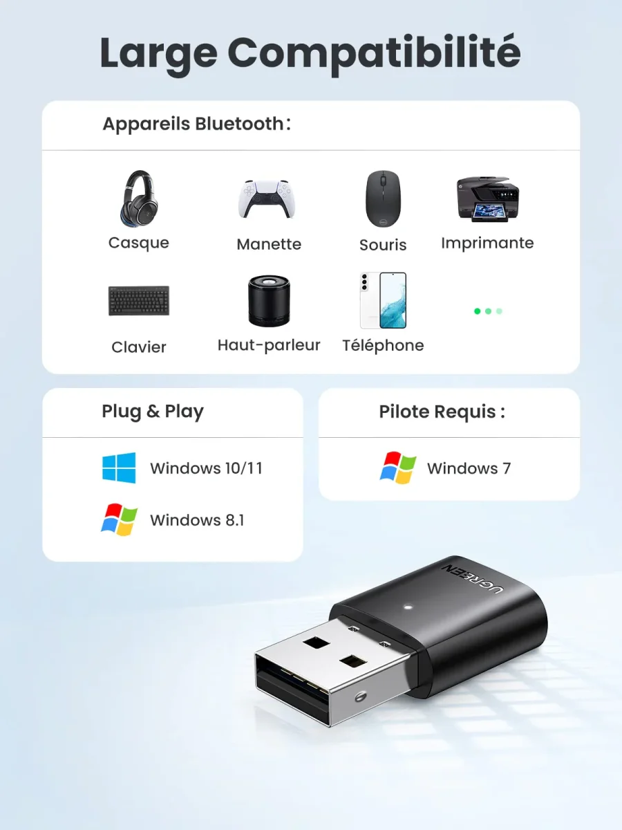 - L’adaptateur USB Bluetooth 5.0 prend en charge la connexion simultanée de 5 appareils Bluetooth différents.