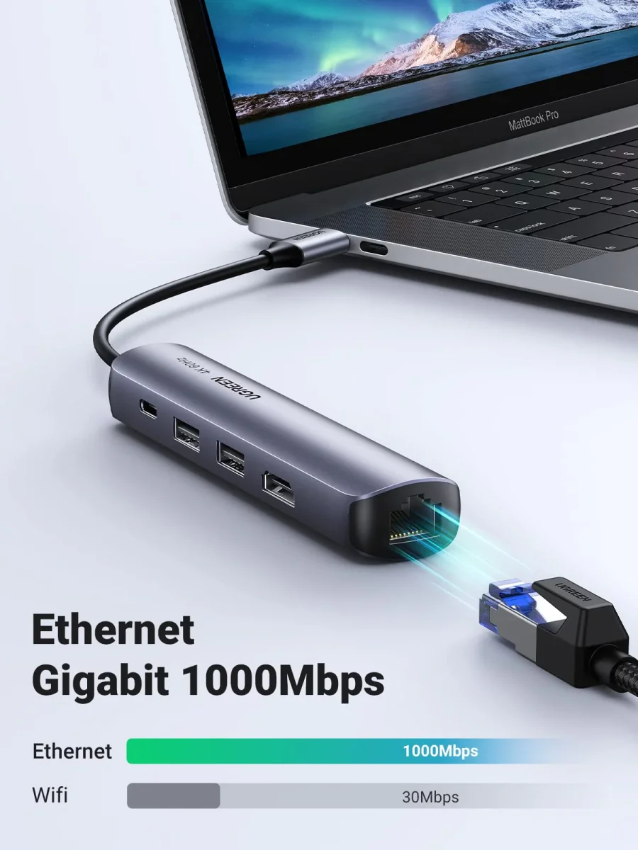 - Le port USB C Power Delivery qui vous permet d’alimenter rapidement votre ordinateur jusqu’à 95W (le hub consomme 5W de puissance).