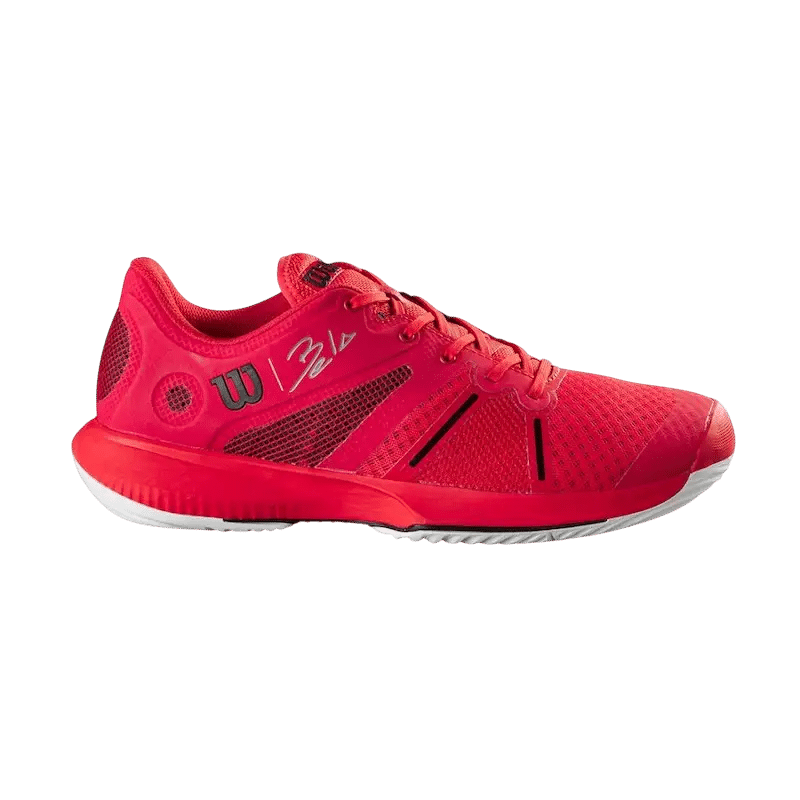 Wilson Bela Pro : chaussures de padel signées Fernando Belasteguín, design rouge avec logo Wilson noir et signature Bela grise. Flexibles et idéales pour des rotations rapides.